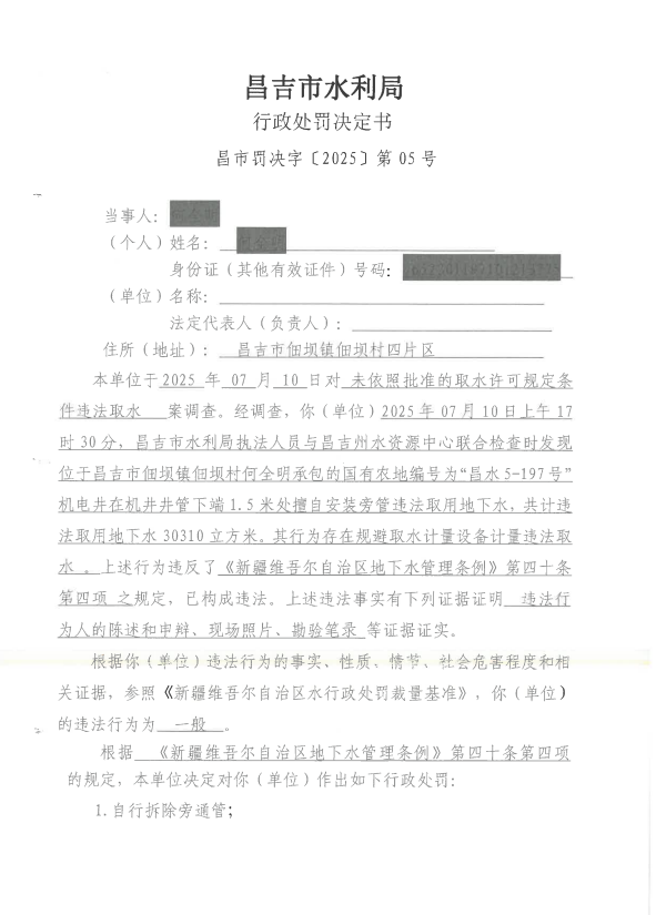 | 文 号 | (昌市)罚决字【2025】05号 | 主 题 词 | 昌吉市 水利局 行政处罚 决定书 2025 05 |
