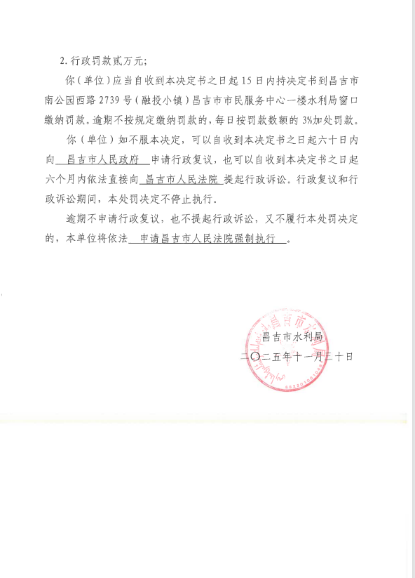 | 名 称 | 昌吉市水利局水行政处罚决定书(昌市)罚决字【2025】05号 | ||