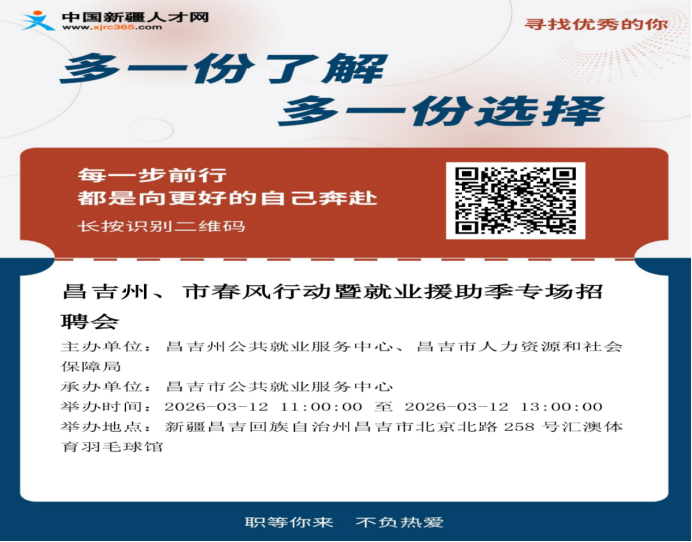 为全面贯彻党的二十大精神和二十届历次会议精神,落实区、州党委、政府稳就业、稳企业、稳市场、稳预期的决策部署,集中力量做好困难群体就业帮扶,支持企业稳定用工,促进高质量就业,根据自治区《关于印发2026自治区春风行动暨就业援助季活动方案的通知》(新人社函〔2026〕32号)文件精神,现决定开展昌吉州、市2026年春风行动暨就业援助季专场招聘会,现就有关事宜通知如下: 01 活动时间 2026年3月12日(星期四)上午11:00-13:00 02活动地点 昌吉汇澳体育馆(北京北路市二中北侧) 汇澳体育羽毛球馆 新疆维吾尔自治区昌吉回族自治州昌吉市北京北路258号羽毛球馆 03活动主题 春风送岗促就业 真诚相助暖民心 04组织单位 主办单位: 昌吉州公共就业服务中心 昌吉市人力资源和社会保障局 承办单位: 昌吉市公共就业服务中心 协办单位: 昌吉市退役军人事务局、昌吉市宁边路街道办事处、昌吉市市总工会、昌吉市市团委、 昌吉市妇女联合会、昌吉市残疾人联合会、石榴快聘 05服务对象 (一)有就业创业意愿的农村劳动者,包括拟外出务工和就近就业创业的农村劳动力,外来务工人员,农村低收入人口等重点帮扶对象。 (二)符合认定条件的就业困难人员,包括失业1年以上、大龄、最低生活保障家庭、身有残疾登记失业人员,最低生活保障家庭、零就业家庭以及其他就业困难人员。 (三)各类未就业高校毕业生、返乡高校毕业生、退役军人及有就业意愿的求职人员。 (四)各类有用工需求单位,特别是重点产业链供应链企业、重点项目企业。 06报名方式 一、手机端报名:用工企业长按下面二维码进行扫码报名,求职者长按下面二维码扫码预约报名并于当天按时参加招聘会。