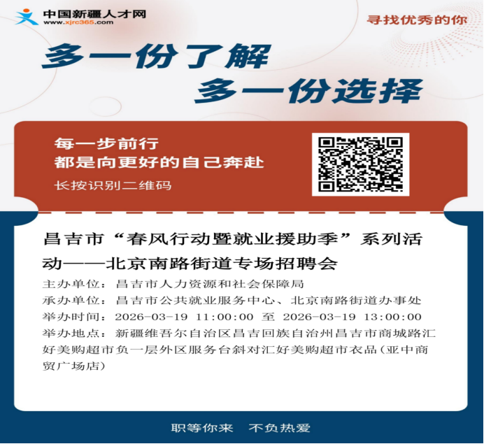 为全面贯彻党的二十大精神和二十届历次会议精神,落实区、州党委、政府稳就业、稳企业、稳市场、稳预期的决策部署,集中力量做好困难群体就业帮扶,支持企业稳定用工,促进高质量就业,现组织开展昌吉市“春风行动暨就业援助季”系列活动——北京南路街道专场招聘会。 01活动时间 2026年3月19日(星期四)上午11:00—13:00 02活动地点 昌吉市商城路汇好美购一楼大厅 汇好美购超市(亚中商贸广场店) 新疆维吾尔自治区昌吉回族自治州昌吉市乌伊西路南侧亚中商贸广场一层11号南区N01 03活动主题 春风送岗促就业 真诚相助暖民心 04组织单位 主办单位: 昌吉市人力资源和社会保障局 承办单位: 昌吉市公共就业服务中心 昌吉市北京南路街道办事处 05服务对象 (一)有就业创业意愿的农村劳动者,包括拟外出务工和就近就业创业的农村劳动力,外来务工人员,农村低收入人口等重点帮扶对象。 (二)符合认定条件的就业困难人员,包括失业1年以上、大龄、最低生活保障家庭、身有残疾登记失业人员,最低生活保障家庭、零就业家庭以及其他就业困难人员。 (三)各类未就业高校毕业生、返乡高校毕业生、退役军人及有就业意愿的求职人员。 (四)各类有用工需求单位,特别是重点产业链供应链企业、重点项目企业。 06报名方式 一、手机端报名:用工企业长按下面二维码进行扫码报名,求职者长按下面二维码扫码预约报名并于当天按时参加招聘会。