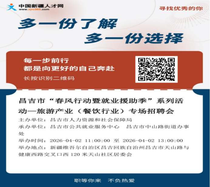 为全面贯彻党的二十大精神和二十届历次会议精神,落实区、州党委、政府稳就业、稳企业、稳市场、稳预期的决策部署,集中力量做好困难群体就业帮扶,支持企业稳定用工,促进高质量就业,现组织开展昌吉市“春风行动暨就业援助季”系列活动—旅游产业(餐饮行业)专场招聘会。