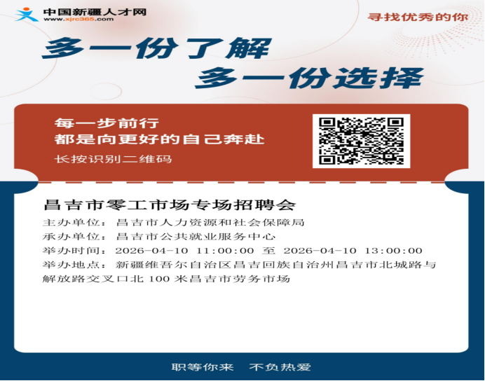 为深入贯彻稳就业、保民生决策部署,精准搭建灵活用工供需对接平台,满足企业阶段性、临时性用工需求,助力零工群体、灵活就业人员、外来务工者实现就近就业,昌吉市公共就业服务中心现决定举办昌吉市零工市场专场招聘会,诚邀各有用工需求的企业、个体工商户及有求职意愿的各类人员踊跃参与。 01活动时间 2026年4月10日(星期五)上午11:00-13:00 02活动地点 昌吉市北门劳务市场 昌吉市劳务市场 新疆维吾尔自治区昌吉回族自治州昌吉市宁边路街道解放路北门幼儿园(中山西路)北侧约60米 03活动主题 零工聚昌吉·就业暖民心——2026年昌吉市四月零工市场专场招聘会 04组织单位 主办单位: 昌吉市人力资源和社会保障局 承办单位: 昌吉市公共就业服务中心 05服务对象 (一)有就业创业意愿的农村劳动者,包括拟外出务工和就近就业创业的农村劳动力,外来务工人员,农村低收入人口等重点帮扶对象。 (二)符合认定条件的就业困难人员,包括失业1年以上、大龄、最低生活保障家庭、身有残疾登记失业人员,最低生活保障家庭、零就业家庭以及其他就业困难人员。 (三)有灵活就业需求的各类未就业人员。 06报名方式 一、手机端报名:用工企业长按下面二维码进行扫码报名,求职者长按下面二维码扫码预约报名并于当天按时参加招聘会。