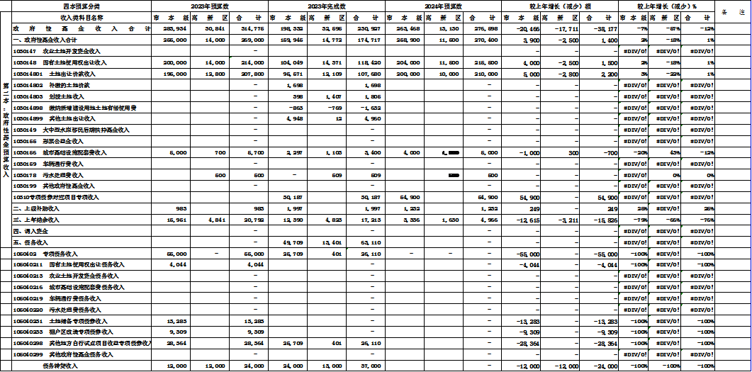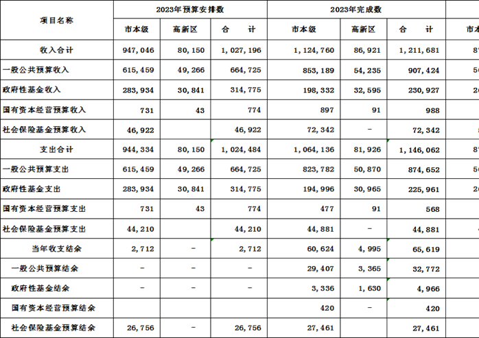 一、2023年财政收入预算执行情况 (一)年初预算安排情况 2023年全市安排地方财政预算收入947046万元,其中:一般公共预算收入615459万元;政府性基金预算收入283934万元;国有资本经营预算收入731万元;社会保险基金预算收入46922万元。 (二)收入预算执行情况 2023年全年实现地方财政收入1124760万元,其中: 1.一般公共预算收入完成853189万元,其中:(1)地方一般公共预算收入375582万元,同比增长1.78%(税收收入205730万元,政府非税收入169852万元);(2)上级补助收入完成306306万元(返还性收入6568万元、一般性转移支付收入255991万元、专项转移支付收入43747万元);(3)调入资金127万元;(4)地方政府一般债务转贷收入79900万元;(5)动用预算稳定调节基金8198万元;(6)上年结余收入83076万元。 2.政府性基金预算收入完成198332万元,其中:(1)政府性基金收入完成159945万元;(2)新增地方政府债务转贷收入24000万元;(3)上级补助收入1997万元;(4)上年结余收入12390万元。 3.国有资本经营预算收入完成897万元,其中:利润收入425万元;上级补助收入153万元;上年结余收入319万元。 4.社会保险基金预算收入完成72342万元,其中:城乡居民基本养老保险基金收入7476万元;机关事业单位基本养老保险基金收入41290万元;上年结余收入23576万元。 二、2023年财政支出预算执行情况 (一)年初预算安排情况 2023年全市安排地方财政预算支出944334万元,其中:一般公共预算支出615459万元;政府性基金预算支出283934万元;国有资本经营预算支出731万元;社会保险基金预算支出44210万元。 (二)支出预算执行情况 2023年全市完成地方财政预算支出1064136万元,其中: 1.一般公共预算支出完成823782万元 按经济分类科目划分为:工资和福利支出215873万元;对个人家庭补助支出60721万元;商品和服务支出83249万元;民生项目保障支出336977万元;转移性支出69132万元;债务还本支出57830万元。 按功能分类科目划分为:一般公共服务支出54508万元;国防支出89万元;公共安全支出56839万元;教育支出117854万元;科学技术支出1307万元;文化旅游体育与传媒支出2929万元;社会保障和就业支出43942万元;卫生健康支出52804万元;节能环保支出27333万元;城乡社区支出162001万元;农林水支出111311万元;交通运输支出10599万元;资源勘探工业信息支出7249万元;商业服务业支出4008万元;金融支出43万元,自然资源海洋气象等支出 2.政府性基金预算支出完成194996万元,主要用于:社会保障和就业支出16万元;征地拆迁补偿支出26421万元;土地开发支出22万元;城市建设支出44244万元;农村基础设施建设支出15093万元;棚户区改造支出9302万元;其他地方自行试点项目收益专项债券收入安排的支出24000万元;彩票公益金安排的支出2699万元;债务付息支出38410万元;债务发行费用支出26万元;债务还本支出34763万元。 3.国有资本经营预算支出完成477万元,其中:用于国有企业资本金注入的支出298万元,解决历史遗留问题及改革成本支出52万元;按政策规定调出资金127万元。 4.社会保险基金预算支出完成44881万元,其中:城乡居民基本养老保险基金支出4888万元;机关事业单位基本养老保险基金支出39993万元。 三、收支预算平衡情况 2023年财政收入完成1124760万元;2023年财政支出完成1064136万元;收支相抵,当年滚存结余60624万元,其中: 一般预算收入合计853189万元;一般公共预算支出合计823782万元;收支相抵,滚存结余29407万元。 政府性基金预算收入完成198332万元;政府性基金预算支出完成194996万元;收支相抵,滚存结余3336万元。 国有资本经营预算收入完成897万元;国有资本经营预算支出完成477万元;收支相抵,滚存结余420万元。 社会保险基金预算收入完成72342万元;社会保险基金预算支出完成44881万元;收支相抵,滚存结余27461万元。 四、2024年财政预算(草案) (一)2024年财政预算收入安排情况 2024年全市安排地方财政预算收入879879万元,其中: 1.一般公共预算收入562445万元,其中:税收收入260128万元,政府非税收入141622万元,增长7%;上级补助收入131116万元(其中:返还性收入6544万元,一般性转移支付收入120459万元,提前下达的专项转移支付收入4113万元),调入资金172万元,上年结转收入29407万元。 2.政府性基金预算收入263468万元,其中:国有土地使用权出让收入200000万元;城市基础设施配套费收入4000万元,上级补助收入1232万元,专项债务对应项目专项收入54900万元,上年结转收入3336万元。 3.国有资本经营预算收入1139万元,其中:利润收入573万元,上级补助收入146万元,上年结转收入420万元。 4.社会保险基金预算收入52827万元,其中:城乡居民基本养老保险基金收入7822万元;机关事业单位基本养老保险基金收入45005万元。 (二)2024年财政预算支出安排情况 2024年全市安排地方财政预算支出876500万元,其中: 1.一般公共预算支出562445万元 按经济分类科目划分为:工资和福利支出238795万元;对个人家庭补助支出20322万元;商品和服务支出22894万元;民生项目保障支出227950万元;转移性支出35067万元;债务还本支出17417万元。 按功能分类科目划分为:一般公共服务支出105974万元;国防支出407万元;公共安全支出48882万元;教育支出84027万元;科学技术支出2244万元;文化旅游体育与传媒支出2283万元;社会保障和就业支出51120万元;卫生健康支出33904万元;节能环保支出10183万元;城乡社区支出26805万元;农林水支出50419万元;交通运输支出6507万元;资源勘探工业信息支出1641万元;商业服