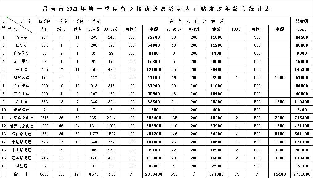 | 名 称 | 昌 吉 市 2021 年 第 一 季 度 各 乡 镇 街 道 高 龄 老 人 补 贴 发 放 年 龄 段 统 计 表 | ||
