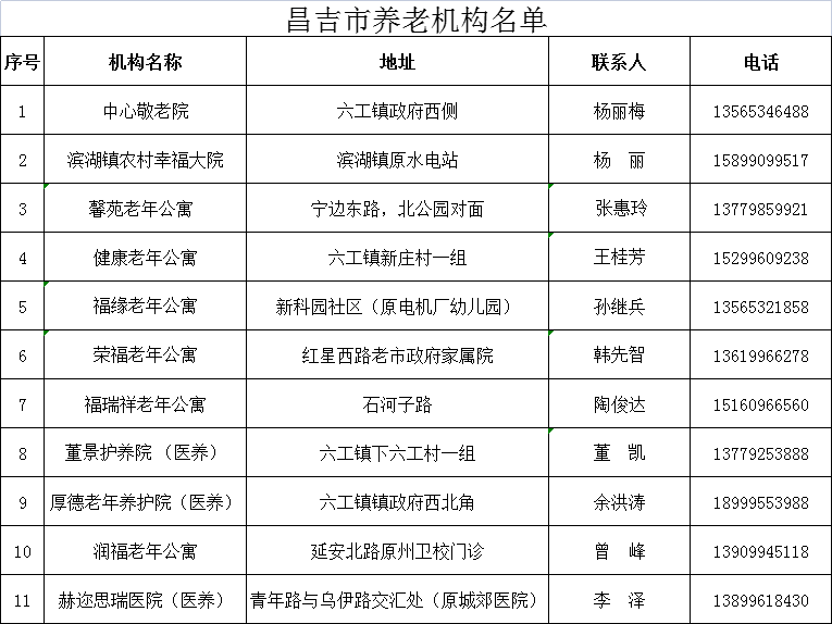 | 名 称 | 昌吉市养老机构名单及联系方式 | ||