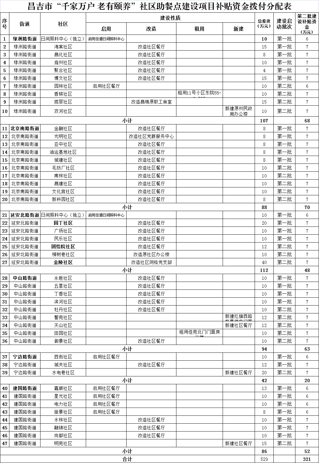 昌吉市“千家万户 老有颐养”社区助餐点建设项目补贴资金拨付分配表(第二批)