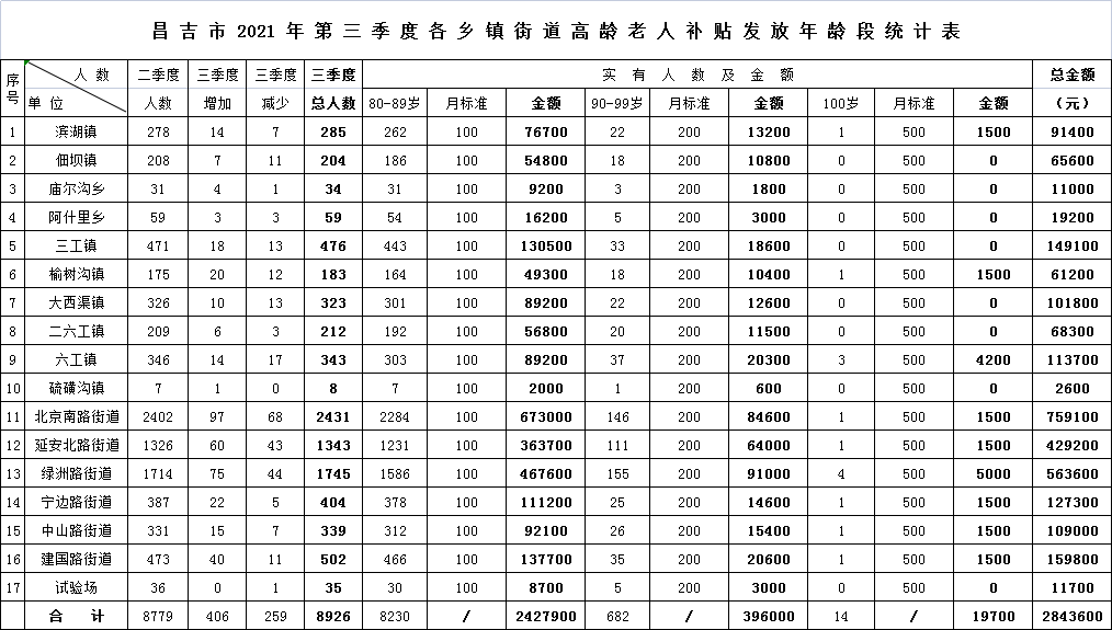 | 名 称 | 昌 吉 市 2021 年 第 三 季 度 各 乡 镇 街 道 高 龄 老 人 补 贴 发 放 年 龄 段 统 计 表 | ||
