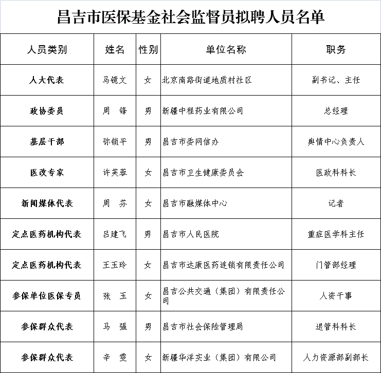 昌吉市医保基金社会监督员拟聘人员名单公示