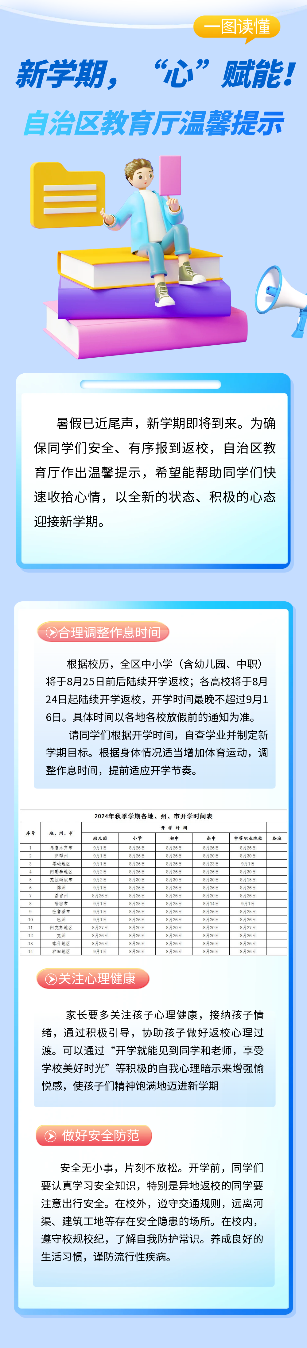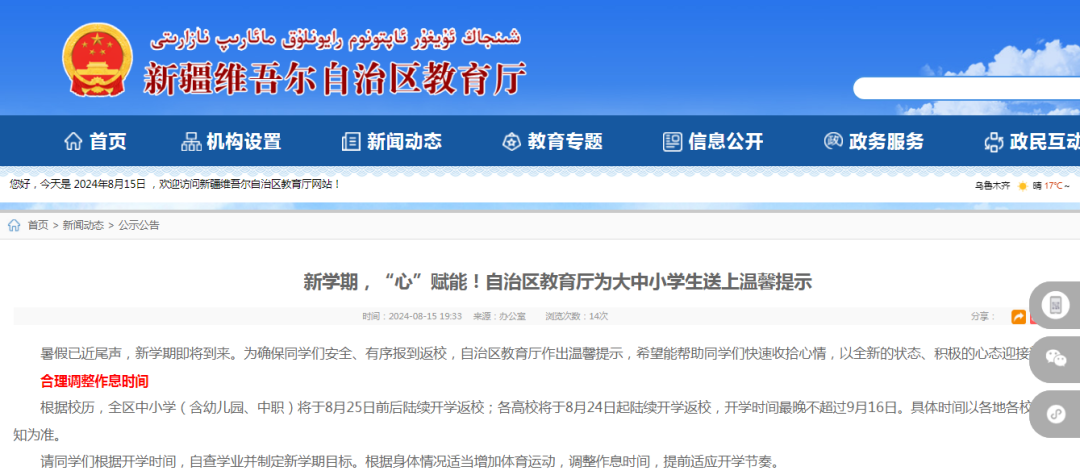 8月15日,自治区教育厅网站发布新学期温馨提示。