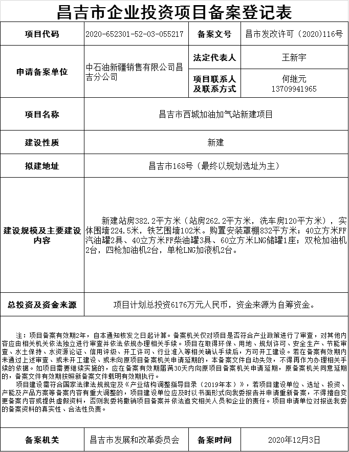 | 文 号 | 昌市发改许可(2020)116号 | 主 题 词 | 昌吉市 西城 加油 新建 |