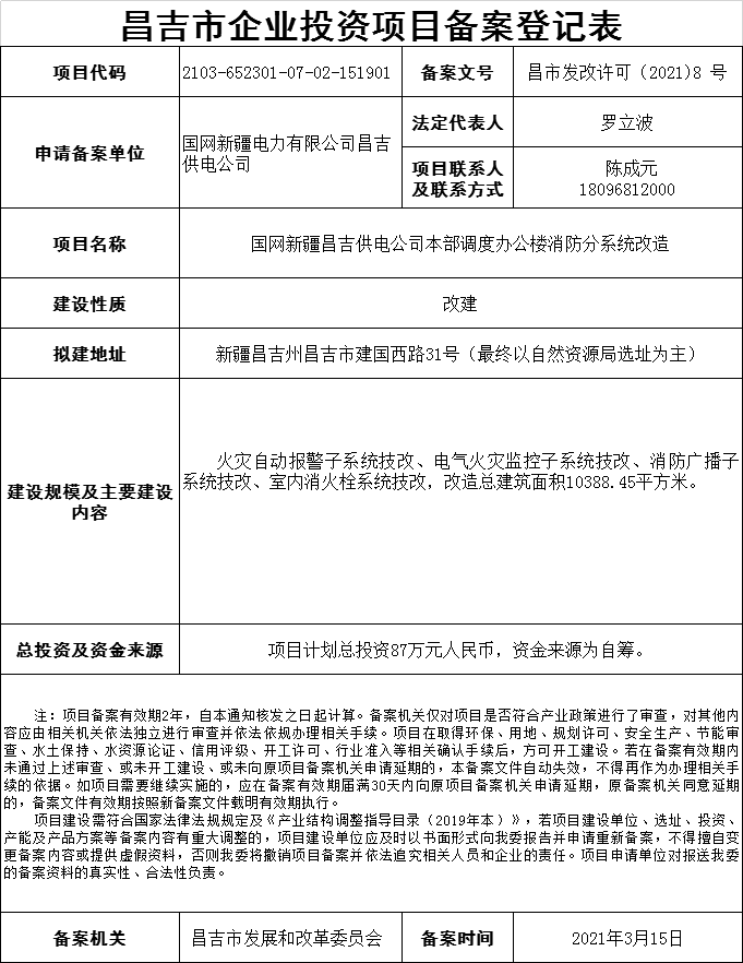 | 文 号 | 昌市发改许可(2021)8 号 | 主 题 词 | 新疆 供电公司 调度 办公楼 消防 改造 |