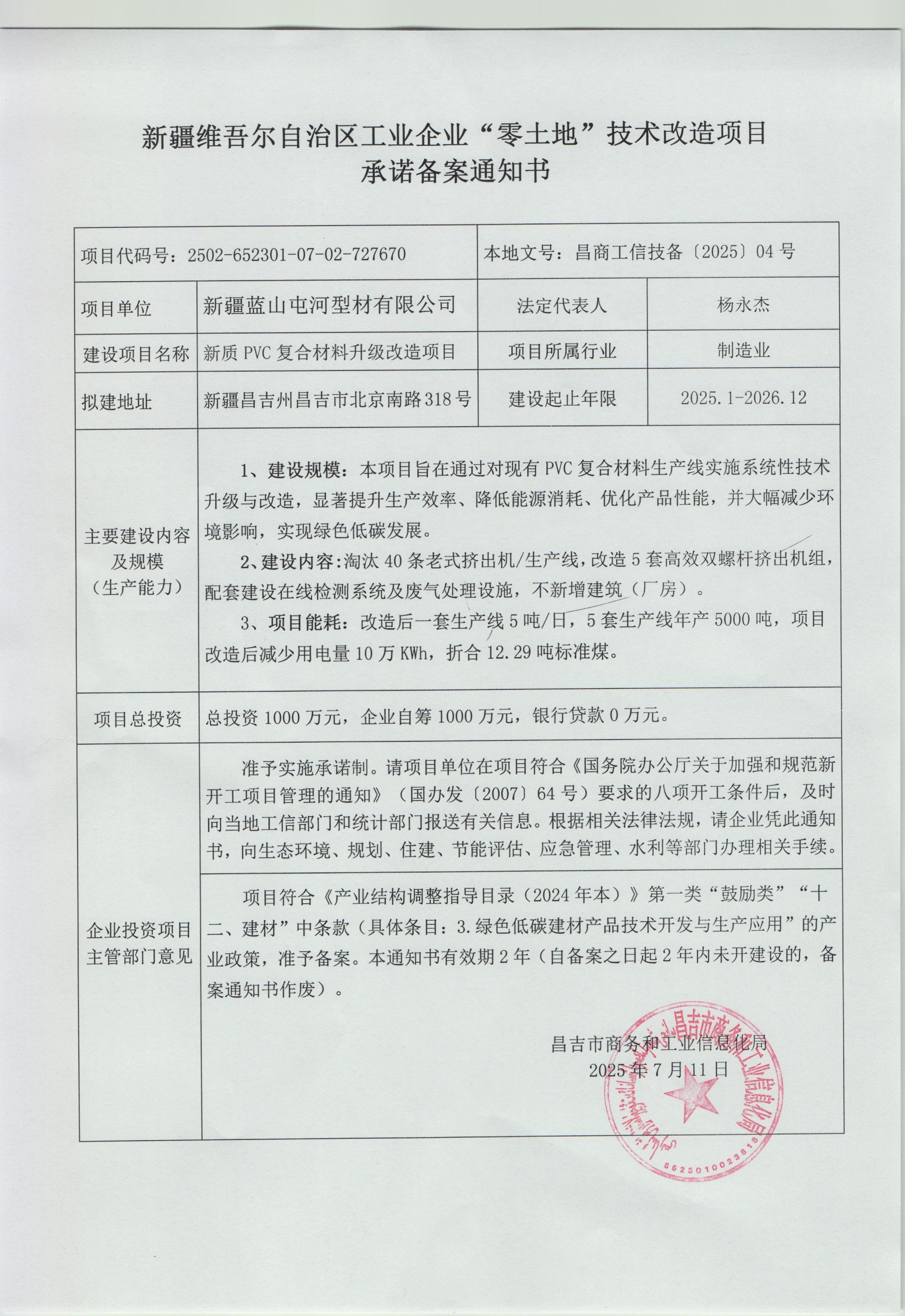 | 名 称 | “零土地”备案通知书-新疆蓝山屯河型材有限公司 | ||