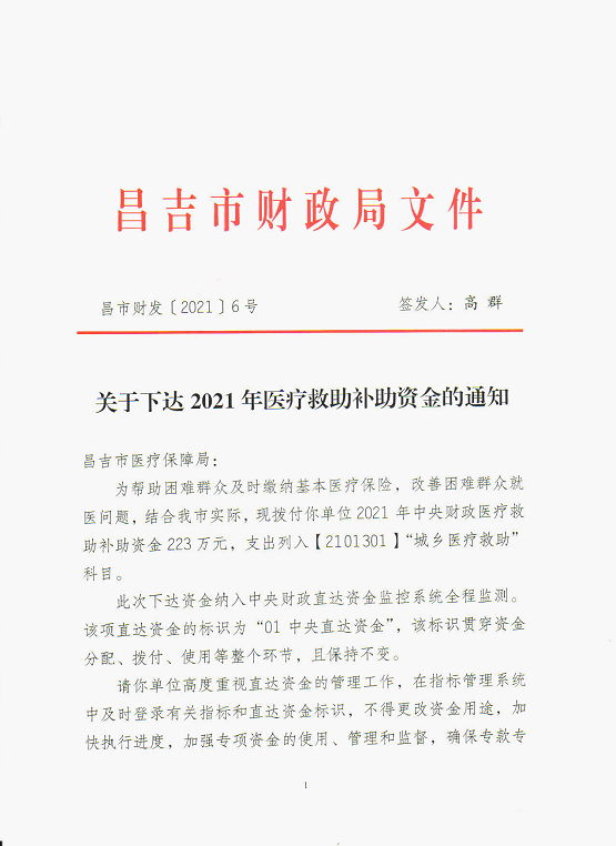 | 名 称 | 关于下发2021年医疗救助补助资金的通知 | ||