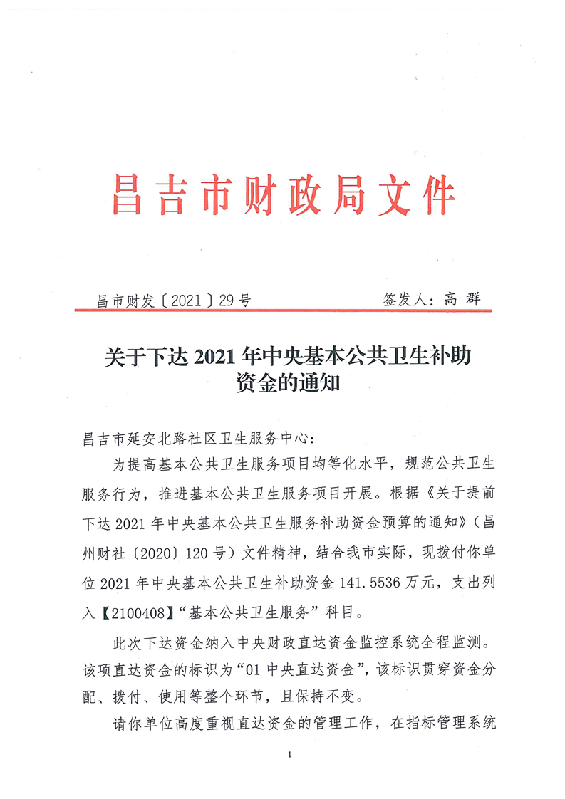 关于下达2021年中央基本公共卫生补助资金的通知(昌市财发〔2021〕29号)