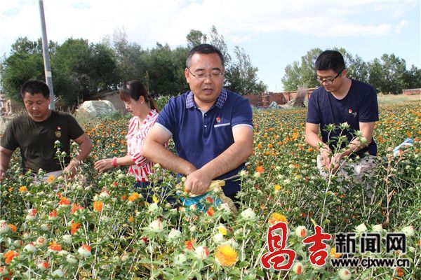 州农业技术推广中心驻吉木萨尔县渭户村“访惠聚”工作队队员帮村民采摘红花。