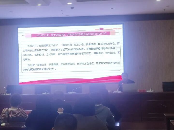 培训过程中,司法局人民参与和促进法治室工作人员,运用业务理论结合实操讲解,对行政调解与新时代司法所建设、人民调解工作平台操作维护及报表填报进行授课,优秀人民调解员马秀萍运用调解技巧及案例分享对基层调解员调解过程中的问题与应对策略进行授课。随后,人民参与和促进法治室主任杨俊从立法背景、出台《条例》的重要意义、如何理解和贯彻条例的具体内容方面对《新疆维吾尔自治区矛盾纠纷多元化解条例》进行了解读。通过此次培训,使各司法所、各人民调解委员会、行政调解委员会能够明确新时期的工作任务和要求,全面提高了自身素质和业务能力,不仅掌握了更多基础业务知识和调解技巧,还增强了责任感和使命感,为更好地履行职责、化解矛盾纠纷打下了坚实的基础。