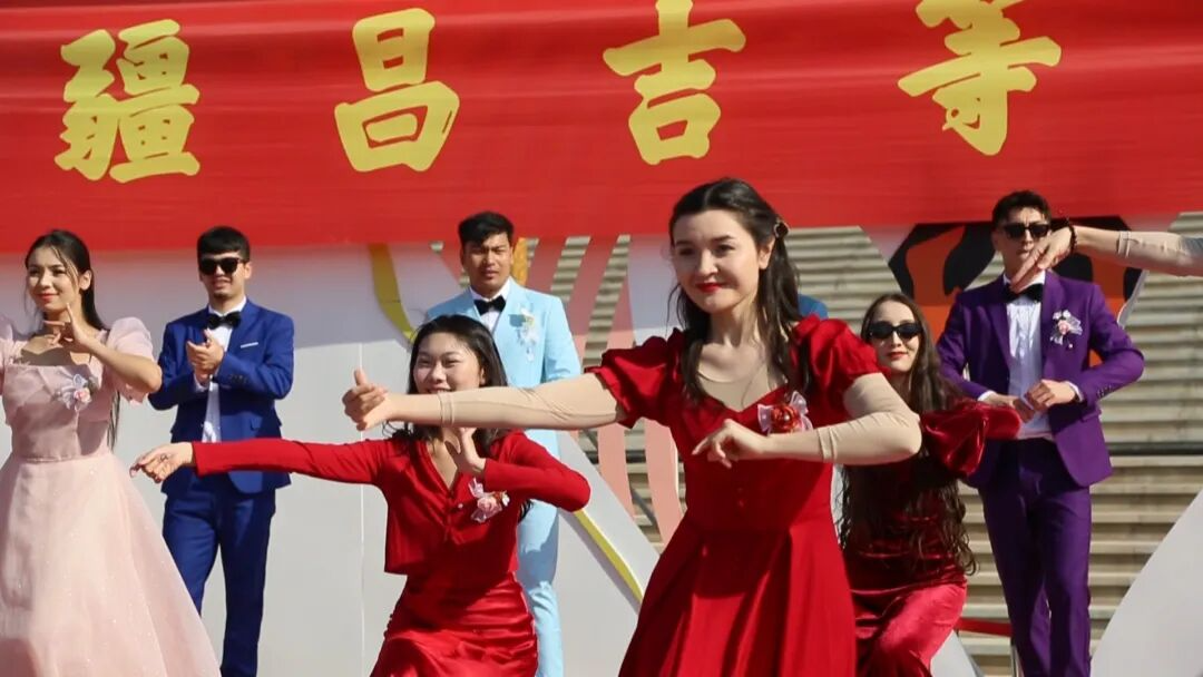 10月12日正午时分,在新疆大剧院外场,一场别开生面的“婚礼”在暖阳中温馨启幕。传统冬不拉的悠扬旋律与现代电音的动感节拍交织共鸣,点燃了整个现场的欢快气氛。每位到场观众都收到一份精致的“喜帖”,成为婚礼的座上宾,可以自由选择加入“新郎兄弟团”或“新娘护卫团”,成为这场盛宴的真正参与者。盛装的演员们踏歌而行,观众们热情相随,迎亲队伍一路欢歌,游客们沉浸其中,时而鼓掌相和,时而喝彩助兴,现场欢声笑语不断。