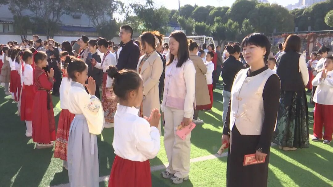 仪式上,学生们与身着传统服饰的家长共同参与了出旗、击鼓、跨过文枢门等庄重环节,并通过正衣冠、向父母行鞠躬礼等仪式,亲身感受中华优秀传统文化的深厚底蕴。这场活动让孩子们在十岁知礼中学会谦恭温雅,在十岁知文中初识诗书雅乐,在十岁知恩中深怀对父母师长的敬爱,真切感悟到生命的成长与蜕变,标志着他们正迈向更加独立、勇敢的人生新阶段。