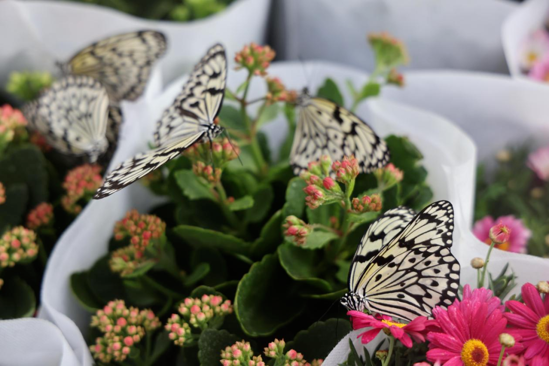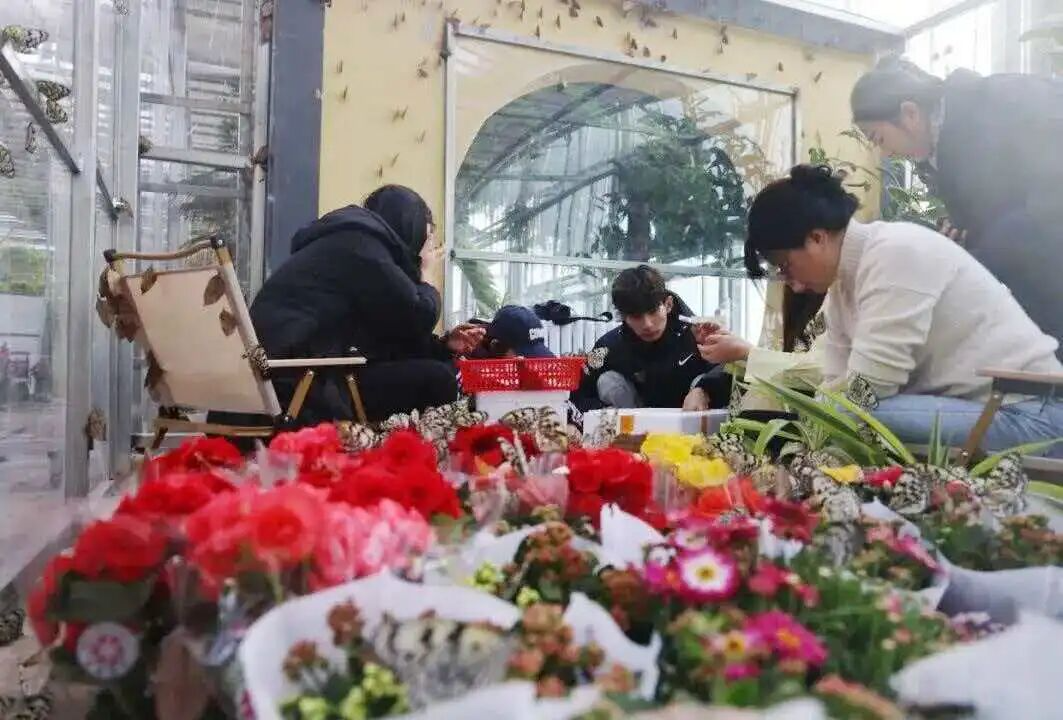 温房内,工作人员正小心翼翼地将蝴蝶逐一放出,蝴蝶或舒展翅膀适应环境,或停落于鲜花之上吸食花蜜,姿态翩跹惹人喜爱。馆内提前开展的直播宣传,已吸引不少市民游客闻讯赶来,抢先感受蝴蝶环绕的浪漫氛围。