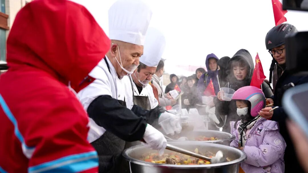 开幕式后,精彩的文艺节目轮番上演。六大NPC互动游戏、美食品鉴等群众文化活动同步开启,为游客带来沉浸式冰雪游玩体验。雪场蒙古包外的围炉煮茶区域人气爆棚,除茶水点心、干果等小食外,还提供了雪地火锅,游客围坐一堂,在冰天雪地中感受别样温暖和惬意。美食区内,大锅炖煮的全牛宴更是香味四溢,让游客大快朵颐,尽享舌尖上的冬日美味。