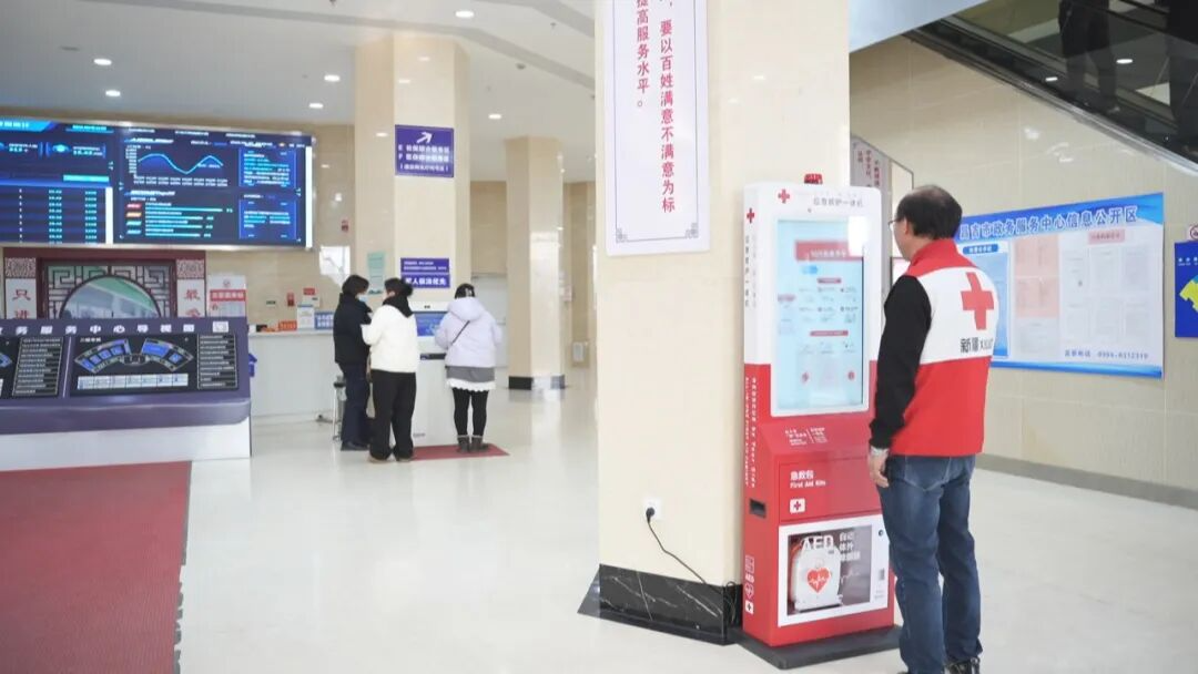 在昌吉政务服务中心,整洁明亮的政务大厅内,醒目的设备箱体和“自动体外除颤器”标识格外醒目。窗口工作人员及物业管理人员系统学习了AED操作要点与心肺复苏标准流程。