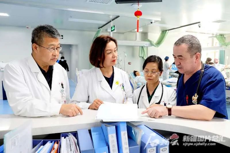 自治区人民医院急救中心主任、新疆急诊质控中心主任穆叶赛·尼加提(左二)和团队医生讨论患者病情。本人供图