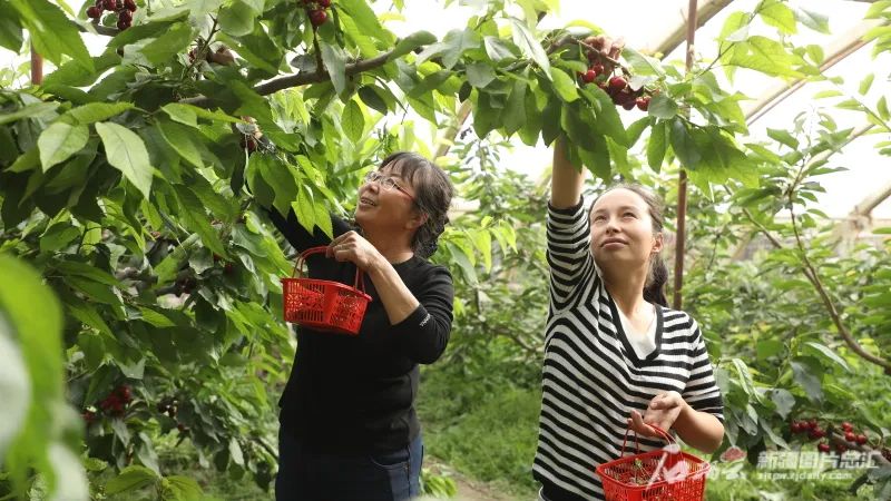 4月29日,寇晓燕(左)和合作社社员在大棚里摘樱桃。第一师阿拉尔市10团昌安镇党建办供图