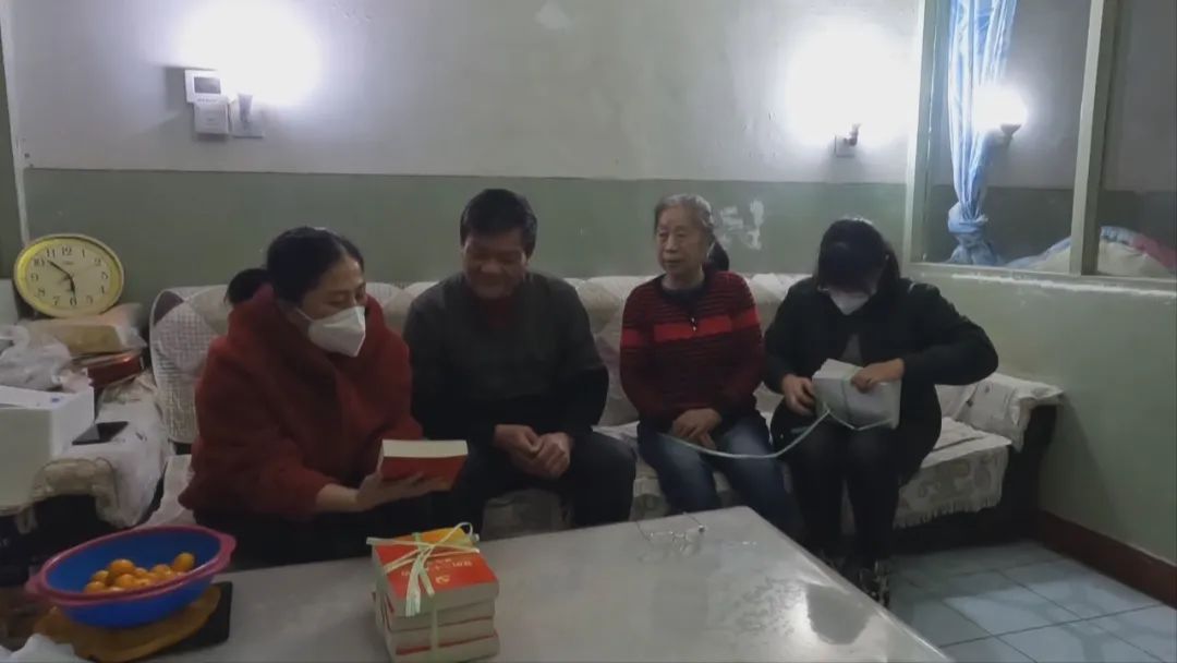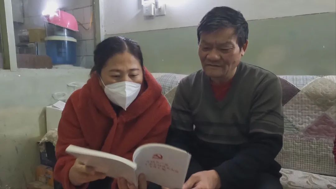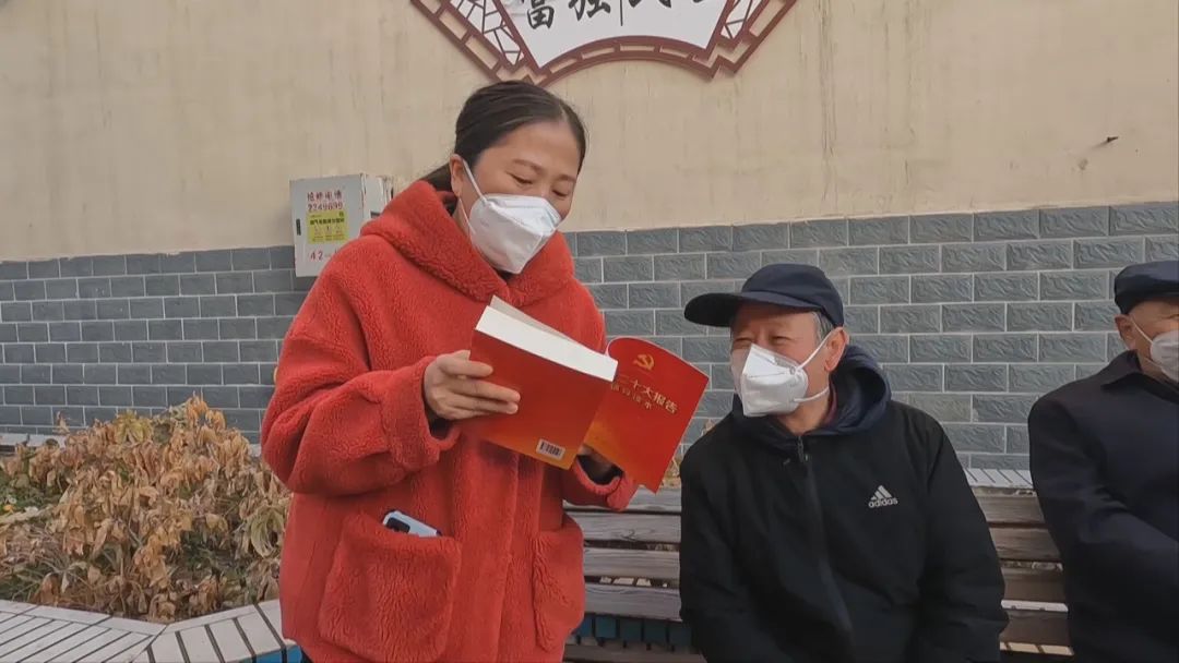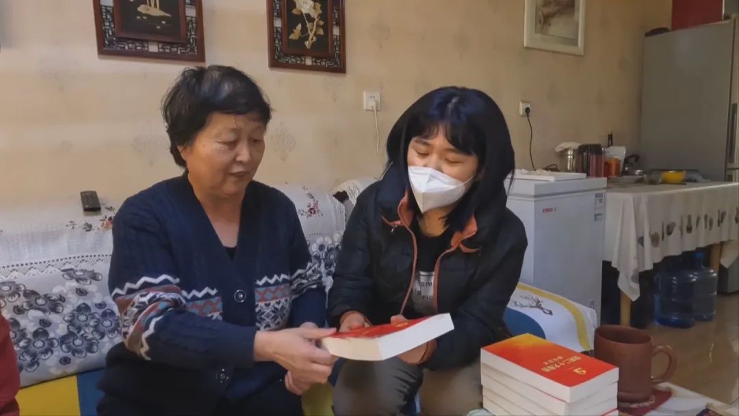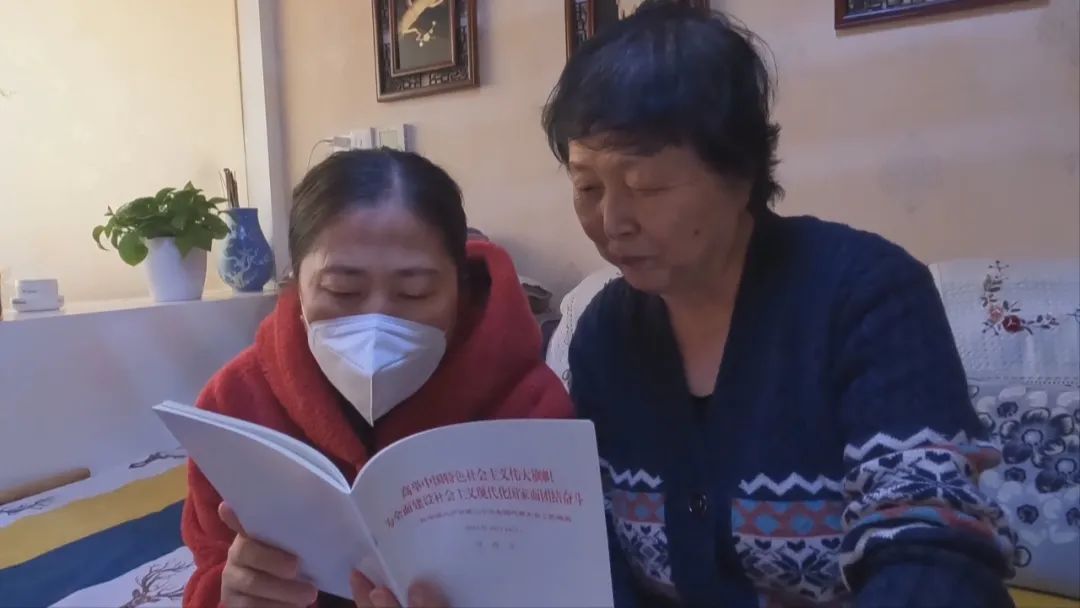 在党员姬秀英家中,地质村社区党总支书记滕志秀逐字逐句地为她朗读党的二十大报告内容,并与她交流学习心得。