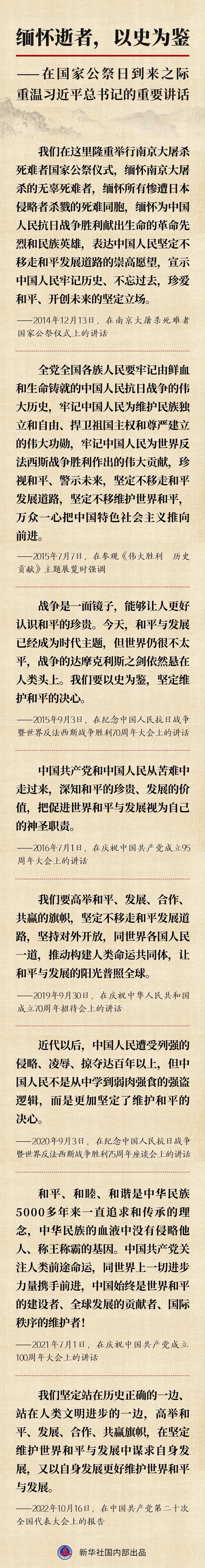 国行公祭,祀我殇胞。在第九个南京大屠杀死难者国家公祭日到来之际,让我们一起重温习近平总书记的重要讲话,缅怀逝者,坚定维护和平的决心,以史为鉴,照亮未来前进的道路。