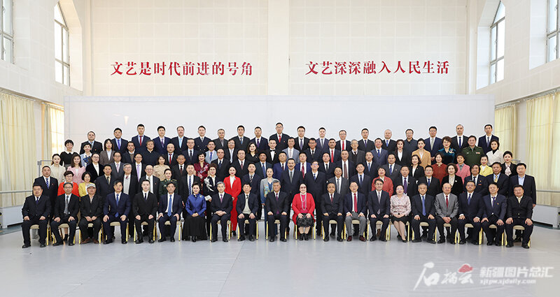 5月9日,自治区党委书记马兴瑞、自治区主席艾尔肯·吐尼亚孜在乌鲁木齐会见第七届“天山文艺奖”获奖者并同大家合影留念。天山网-新疆日报记者 崔志坚 摄