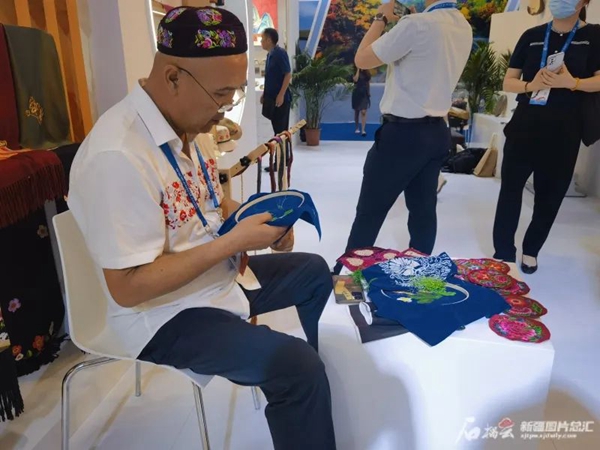 新疆展区里播放的原创舞台剧目,非物质文化遗产歌舞展演,手工制作技艺、刺绣作品、玉石、图书出版等展示,吸引了各地参展商和参观者。