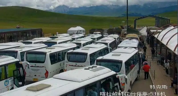 喀拉峻景区鲜花台停靠点的排队车辆。喀拉峻景区供图