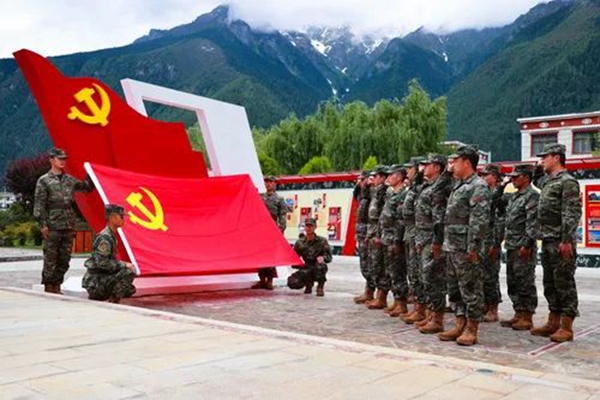 驻守在西藏高原的武警第二机动总队某支队官兵重温入党誓词。陆文凯摄(人民视觉)