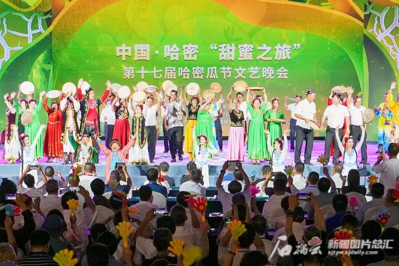 7月19日,中国·哈密“甜蜜之旅”第十七届哈密瓜节文艺晚会上,国家级非物质文化遗产哈密十二木卡姆表演场景。 李华摄