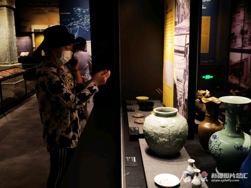 新疆博物馆“新疆历史文物展”上的陶瓷品受游客关注。 石榴云/新疆日报记者 银璐摄