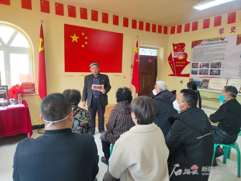 沙勒克江·依明在自家小院的爱国主义教育基地里宣讲党的二十大精神。 陈媛摄