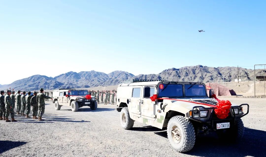 良辰吉时,营区内鞭炮齐鸣,11位新郎乘坐战车,向着爱情的方向出发。新郎官们经过“战车娶亲”“勇闯盾牌”“齐唱军歌”等接亲环节的“挑战”,分别接到了自己的新娘,登车前往营区外5公里的典礼现场。在戈壁滩搭设的简易舞台上,11对新人在迎宾墙上签下了姓名和爱情宣言。