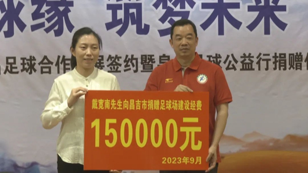 市委副书记、福建援疆泉州市分指挥部指挥长蒋文强参加活动并致辞,蒋文强代表市委、福建援疆泉州市分指挥部对泉州市足协开展援昌资助活动表示热烈的欢迎和衷心的感谢。在签约、捐赠仪式上,泉州市足协与昌吉州足协签订了《泉昌足球战略合作协议》。泉州市政协原副主席、泉州市足球协会会长王春金,泉州师范学院原纪委书记、泉州市足球协会书记邓世章代表泉州市足协向昌吉市捐赠青少年足球发展资金5万元和一批足球装备。福建省足协副会长、南安市足协会长戴宽南个人捐赠了15万元资金,作为捐建昌吉市一个五人制足球场的经费。市委常委、副市长、福建援疆泉州市分指挥部副指挥长王昭昭向戴宽南回赠了“热心公益、情系绿荫”牌匾以示感谢。