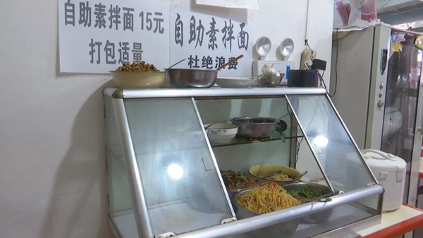 临近的兴源香辣擀面皮、自助素拌面店是一家经营多年的老店。店面虽然不大,生意却不清淡,在不到半小时的时间里,不断有街坊邻居、外卖小哥来此就餐。粗略统计有近20多人。