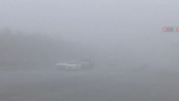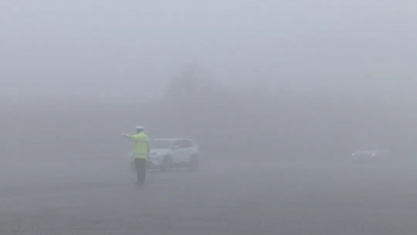 驾驶员王彦魁说,昨天刚下过雨,今天雾比较大,我们开车要慢一点,打开双闪,交警在道路上指挥交通,大家要注意安全,路上小心开车。