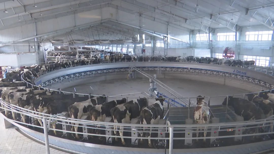 现代牧业(昌吉)有限公司 挤奶处高级主管庞从旭说:“目前牧场配备大小挤奶厅共计两座,所有的设备采取全封闭式自动化,全程无接触,可以有效保障牛奶品质,目前的牛奶品质脂肪每100毫升达到4.0(g/mL)以上,蛋白每100毫升达到3.3(每100g)以上,微生物控制在0.5(万CFU/mL)以内,超欧盟标准。”