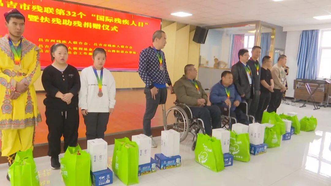 活动现场向8名孤独症儿童、11名自主创业残疾人、11名自治区第七届残疾人运动会暨第四届特殊奥林匹克运动会昌吉市获奖运动员赠送了爱心礼包。