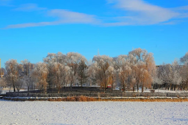 忽如一夜春风来,千树万树梨花开。这几天,冬日的昌吉市滨湖河中央公园宛如童话世界,树木、植被上挂满了一串串晶莹剔透的雾凇,似满树银花。