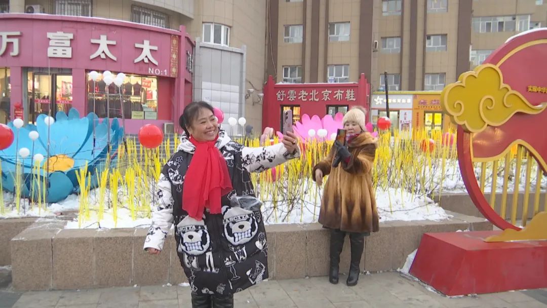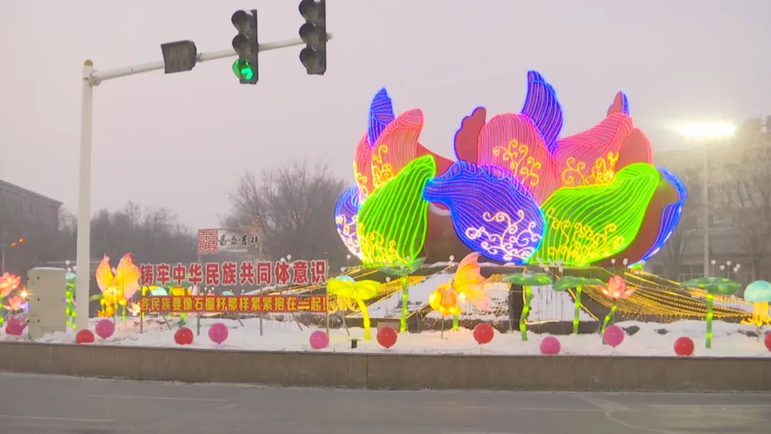在昌吉市地标性建筑“飞马”转盘点位,龙纹花瓶、金色彩条、鲜艳的牡丹、金色的麦穗等饰品和彩灯交相呼应、如梦如幻,氛围感十足。市民们纷纷驻足观赏,打卡拍照。