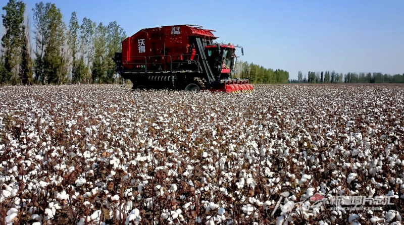 2023年9月,在沙湾市乌兰乌苏镇城庄子新村大型采棉机在棉田来回穿梭采收棉花。关兵 摄