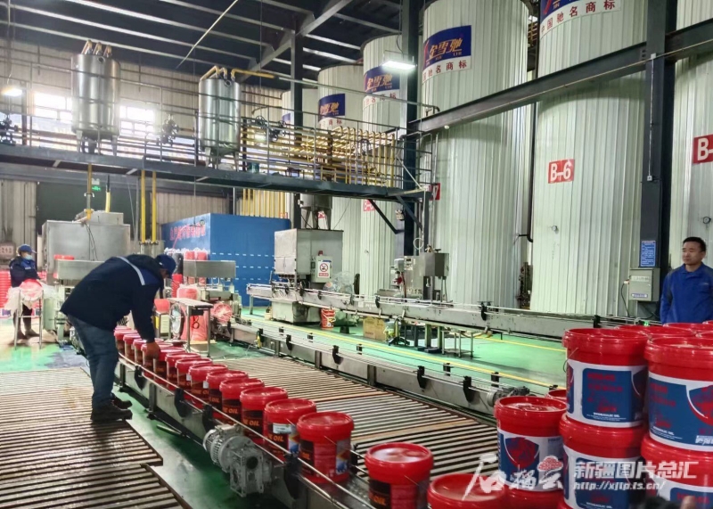 ——新疆金雪驰科技股份有限公司全新配备了国内先进的脉冲调和系统、智能化自动灌装生产线、全自动机械手和智能控制系统,实现了调和、灌装、打包到发货的一站式智能化交付。目前,企业日均生产润滑油400吨,产品畅销中亚国家。