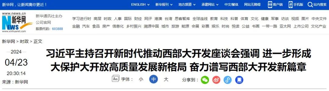 4月23日下午,习近平总书记在重庆主持召开新时代推动西部大开发座谈会并发表重要讲话。新华社以“进一步形成大保护大开放高质量发展新格局奋力谱写西部大开发新篇章”为主标题做了报道。
