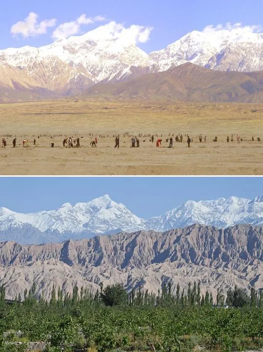 这是一张拼版照片,上图为2006年,人们在柯柯牙植树造林(资料照片);下图为2023年8月30日拍摄的柯柯牙一处经济林(新华社记者李响摄)。新华社发