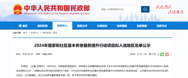 近日,民政部养老服务司、财政部社会保障司联合印发《关于2024年居家和社区基本养老服务提升行动项目拟入选地区名单的公示》明确拟将北京市延庆区等50个地区作为2024年居家和社区基本养老服务提升行动项目拟入选项目地区,现予以公示。