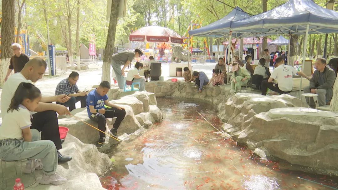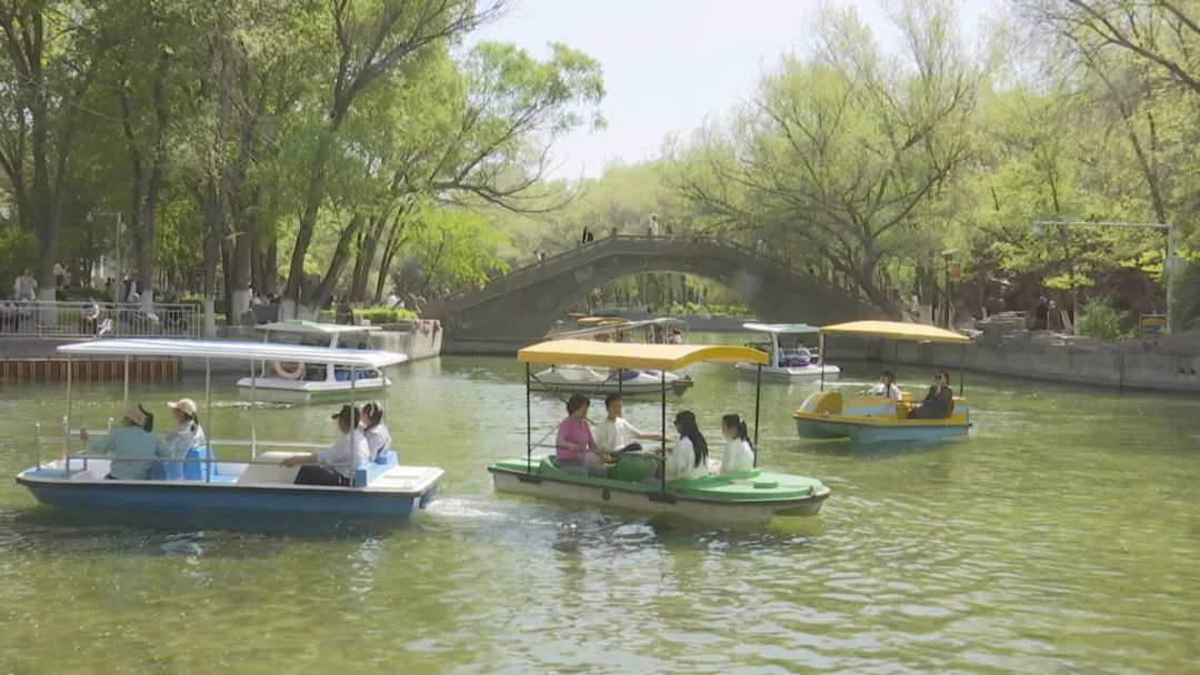 在昌吉市人民公园,游客们或赏花游玩,观赏风车展,或在湖面划船享受静谧时光,悠闲度假。